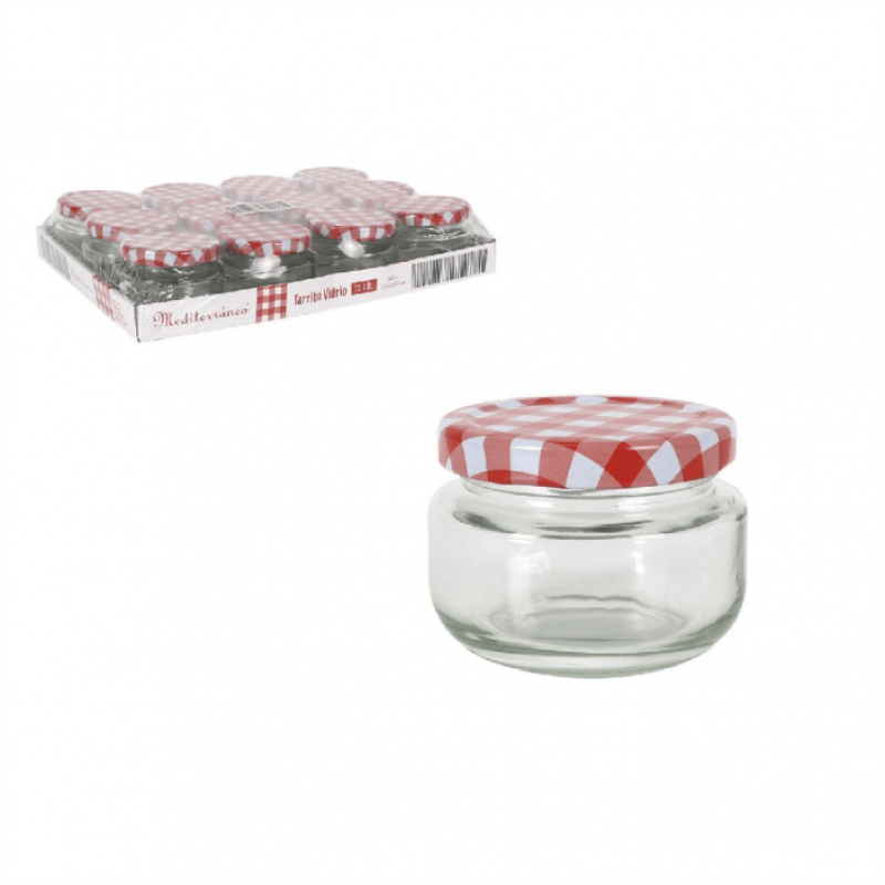 Frasco de vidro com tampa aos quadrados brancos e vermelhos com capacidade de 140 ml