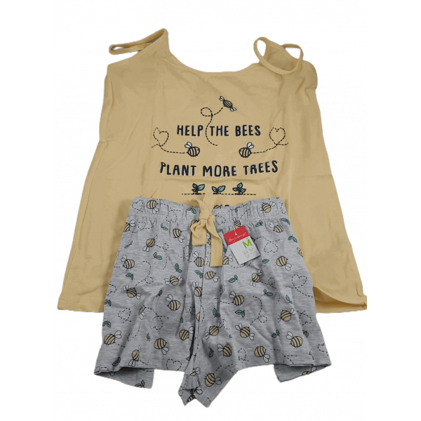 Pijama Abelha com Calções e Top de alças para adultoNo top pode ler-se "Help the bees, plant more trees" que se traduz para 'Ajude as abelhas, plante mais árvores'Os tamanhos do pi..